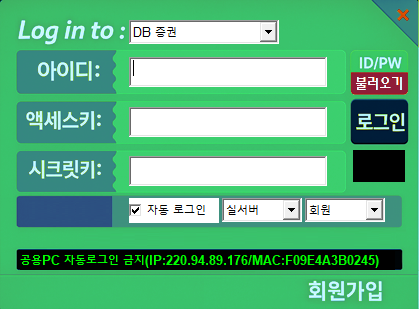 STOCK-GATE를 실행하면 아래 로그인 창에서, 증권사를 선택후, 아이디, 액세스키, 시크릿 키 를 입력하시거나, “ID/PW 불러오기” 버튼을 누르면, 앞에서 저장한 텍스트 파일을 선택하시면, 쉽게 아이디, 액세스키, 시크릿 키 가 입력됩니다.